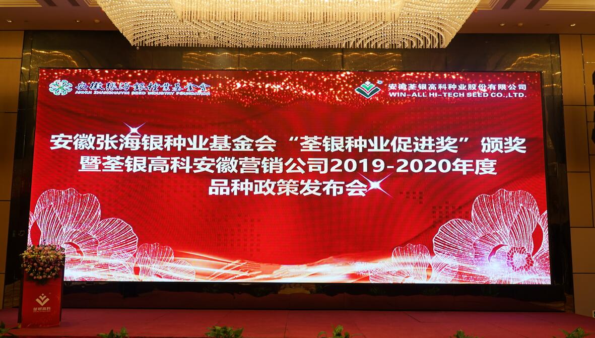 ??? 深耕種業(yè),不忘初心。8月19-20日,安徽張海銀種業(yè)基金會(huì)2019年“荃銀種業(yè)促進(jìn)獎(jiǎng)”頒獎(jiǎng)大會(huì)暨荃銀高科安徽營(yíng)銷公司品種政策發(fā)布會(huì)在安徽蕪湖隆重召開(kāi)。安徽省種子管理總站副站長(zhǎng)劉根、中國(guó)貿(mào)促會(huì)蕪湖市支會(huì)會(huì)長(zhǎng)常拯、蕪湖市種子管理站副站長(zhǎng)陳煒平、安徽荃銀高科種業(yè)股份有限公司副董事長(zhǎng)兼總經(jīng)理張琴、常務(wù)副總經(jīng)理兼營(yíng)銷總監(jiān)王玉林、安徽張海銀種業(yè)基金會(huì)秘書(shū)長(zhǎng)張彤、建設(shè)銀行、益海嘉里等單位相關(guān)領(lǐng)導(dǎo)及安徽、江蘇、河南等省近200位種業(yè)精英們參會(huì)。